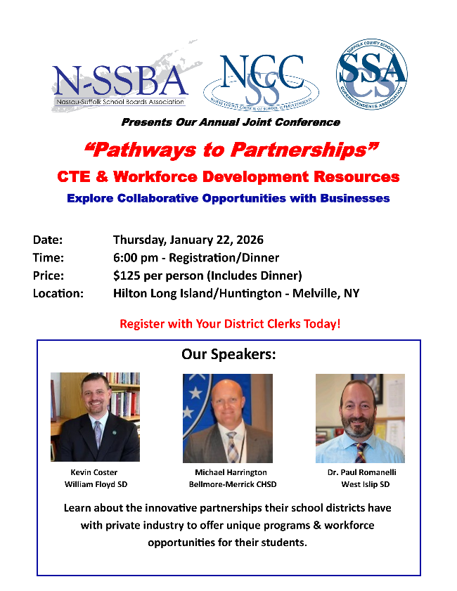 We partner with our local superintendents’ associations (NCCSS & SCSSA) to align advocacy efforts and work together when dealing with media relations. We have formed strong working relationships with our federal, state, and local elected officials to help Long Island public education continue to be one of the best systems in the country.