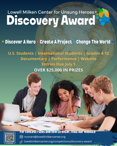 For its 2025 international Discovery Award competition, the Lowell Milken Center for Unsung Heroes (LMC) has awarded over $21,500 in cash prizes to elementary, middle and high school students. This annual competition inspires students to develop primary and secondary research projects that highlight the powerful historical impact of Unsung Heroes whose stories remain little-known.