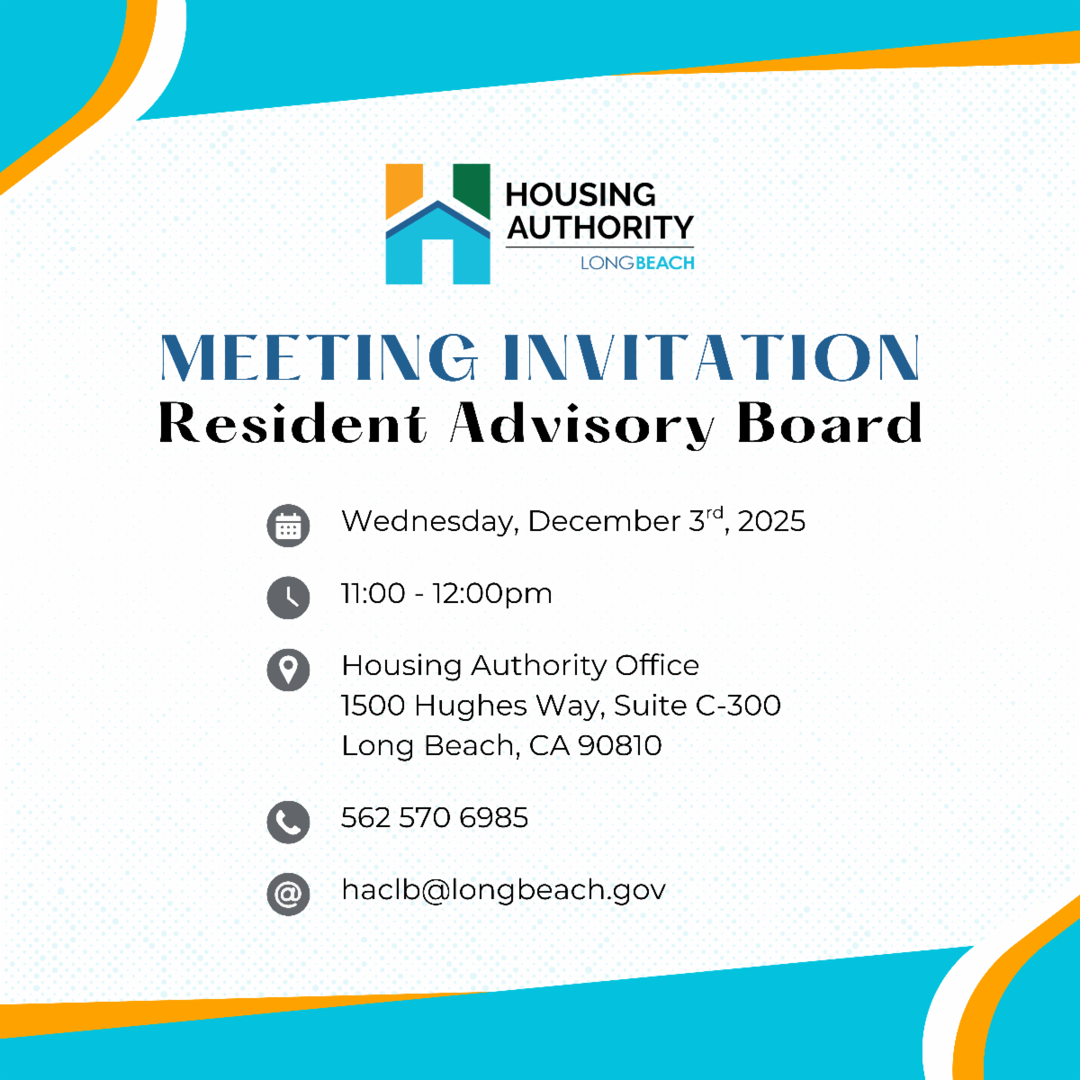 The Housing Authority of the City of Long Beach invites you to attend our Annual Resident Advisory Board (RAB) Meeting, taking place in person on Wednesday, December 3, 2025, at 11:00 a.m.