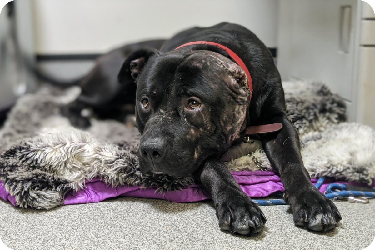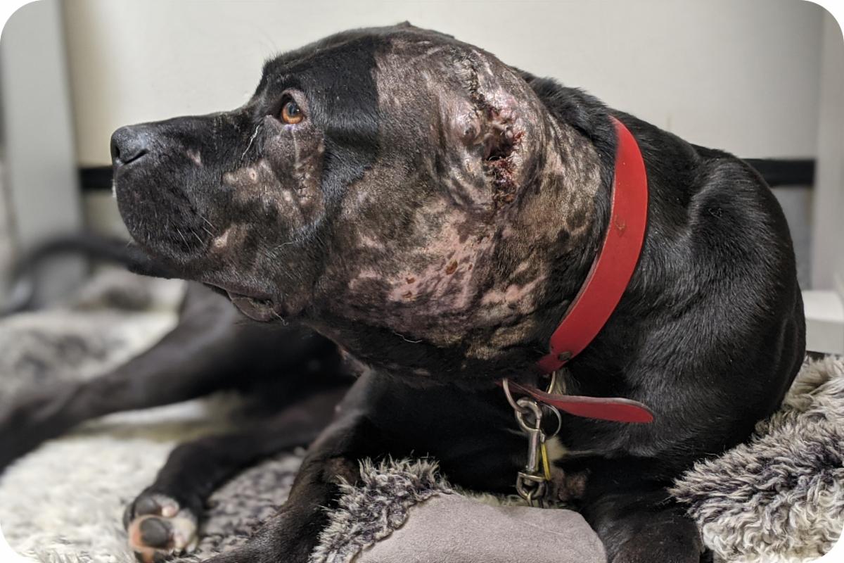 The vet treated his severe injuries, stitched him up and sent him home with antibiotics and anti inflammatories. Five days later, he returned to the vet, with severe infections of the face and ear needing further large doses of antibiotics, but later that evening was rushed back to the vet, as his ear had split due to the infection and swelling. Examination showed the ear pinnae completely necrotic and needed amputation.