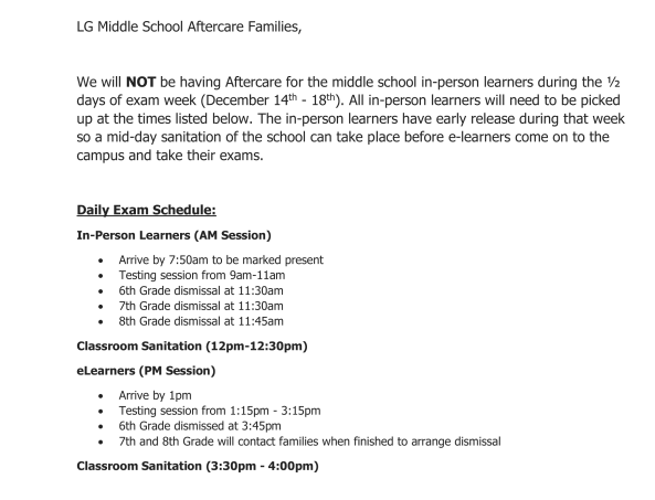 Middle School (6-8) Mid-Term Testing Week is December 14-18, 2020.