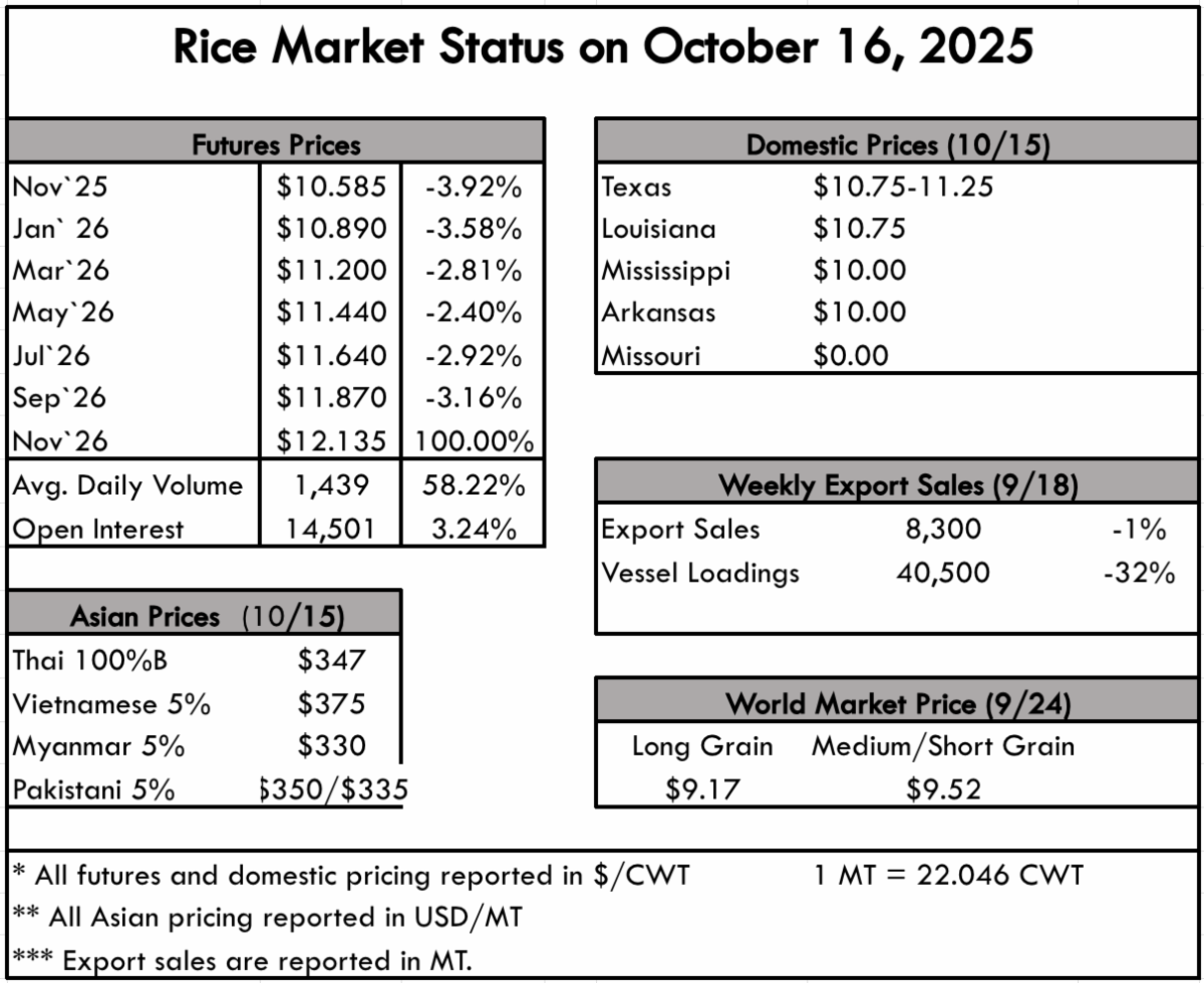 Looking ahead to the 2026 planting season, the question is not the number of acres but who will plant rice as reports of bankruptcy continue. Fertilizer price increases, higher equipment service costs, and the lack of labor in all areas of agriculture pressure farmers everywhere while farm prices are far below the cost of production. Market price outlook will determine 2026. The cloud that hovers over the market is the competition from India, Thailand, and Vietnam that presents unfair challenges.