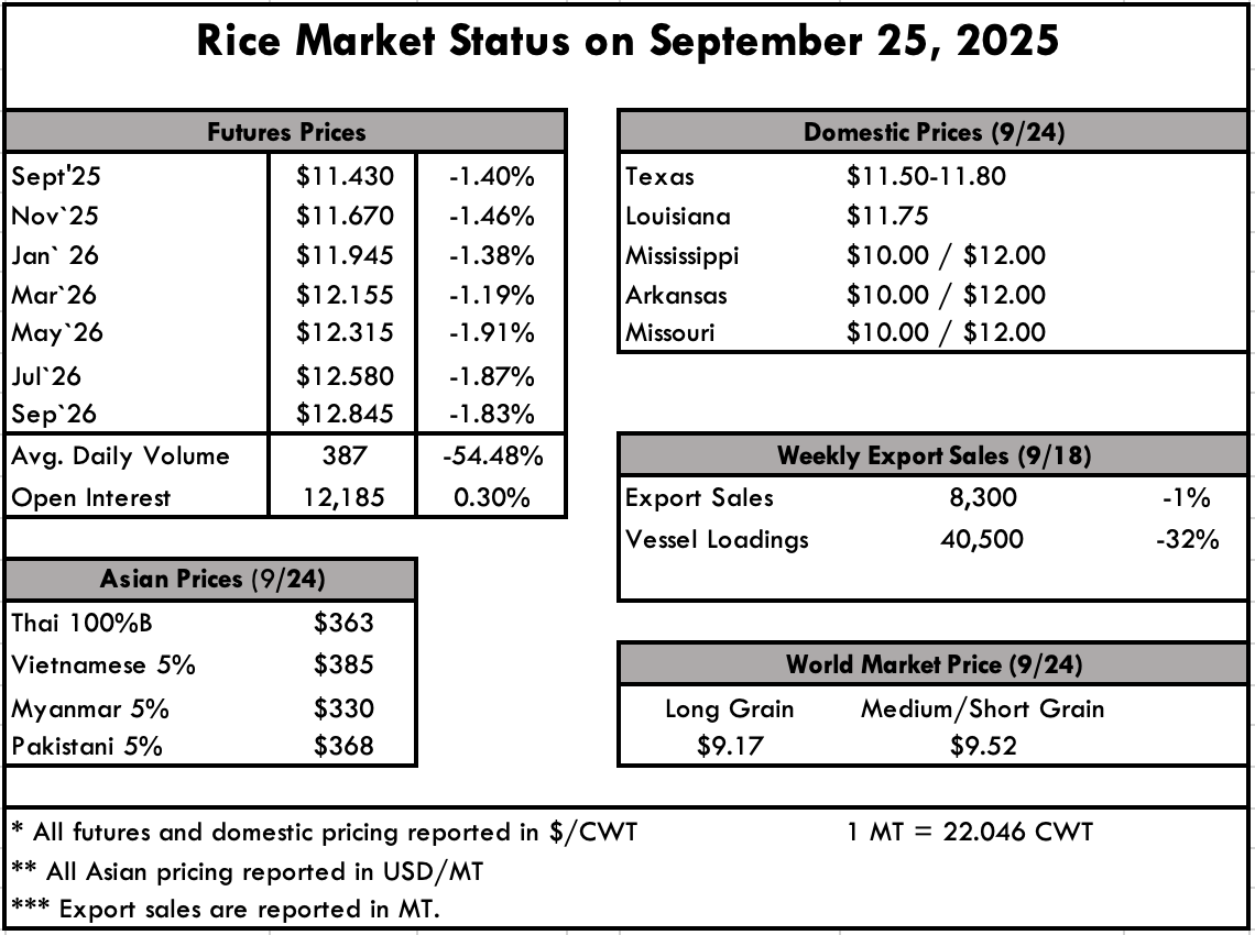 Harvest continues to move on without much of a problem, with Arkansas now on the downhill side, approaching 80% complete. Louisiana is over 95%, as is Texas. Mississippi is at 73%, and Missouri is at 60%. California, as always, is the last to harvest but is in full swing, now approaching 30%. Milling yields from Louisiana to Arkansas are being reported as average, i.e.: 55/70. There was some hope early that we would see a significant increase, but as more of the crop is moving, it seems to be averaging out overall. The real trick will be selling all of it into a market that is flooded with cheap rice from Asia/India, and increased competition from South America.