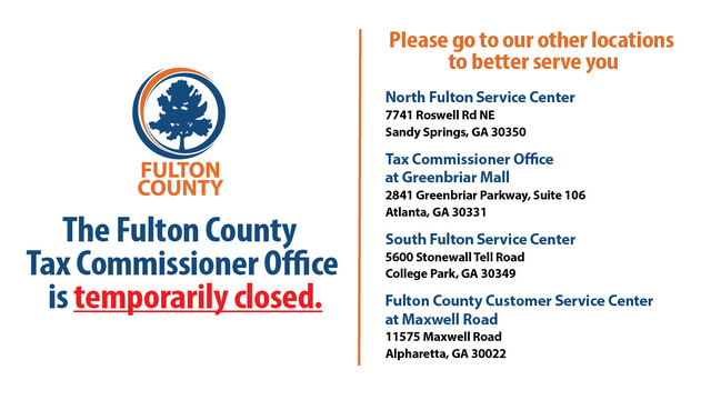 Currently, the Fulton County Tax Commissioner’s Office at Fulton County Government Center, 141 Pryor Street NW, is closed for cleaning and sanitizing.