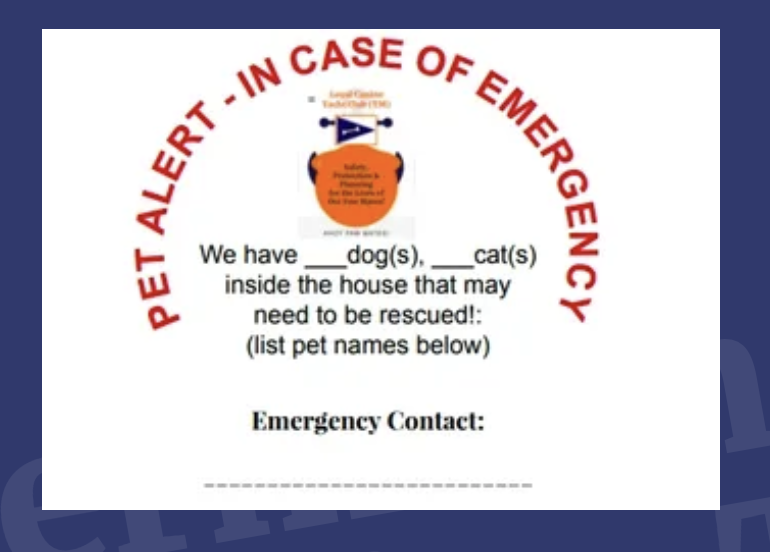 Make sure and protect your pets when they are left home alone or in the event of a disaster. If a firefighter or emergency responder sees these stickers they will make an effort to search for the pets without compromising human safety. Stickers should be placed on all doors to the outside and any big windows.