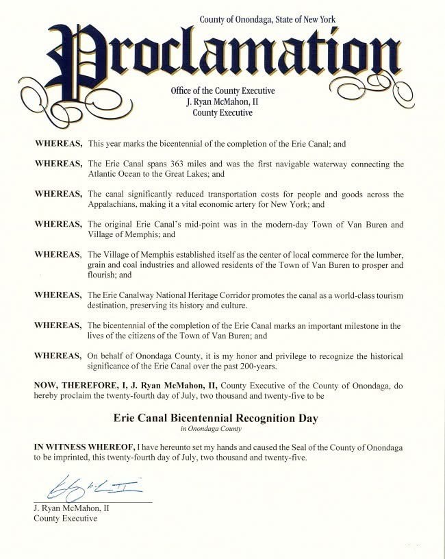 | County Executive McMahon Honors Erie Canal Bicentennial Celebration With A Proclamation | County Executive McMahon visited the Hamlet of Memphis in the Town of Van Buren to present a proclamation honoring the Erie Canal's Bicentennial! | |