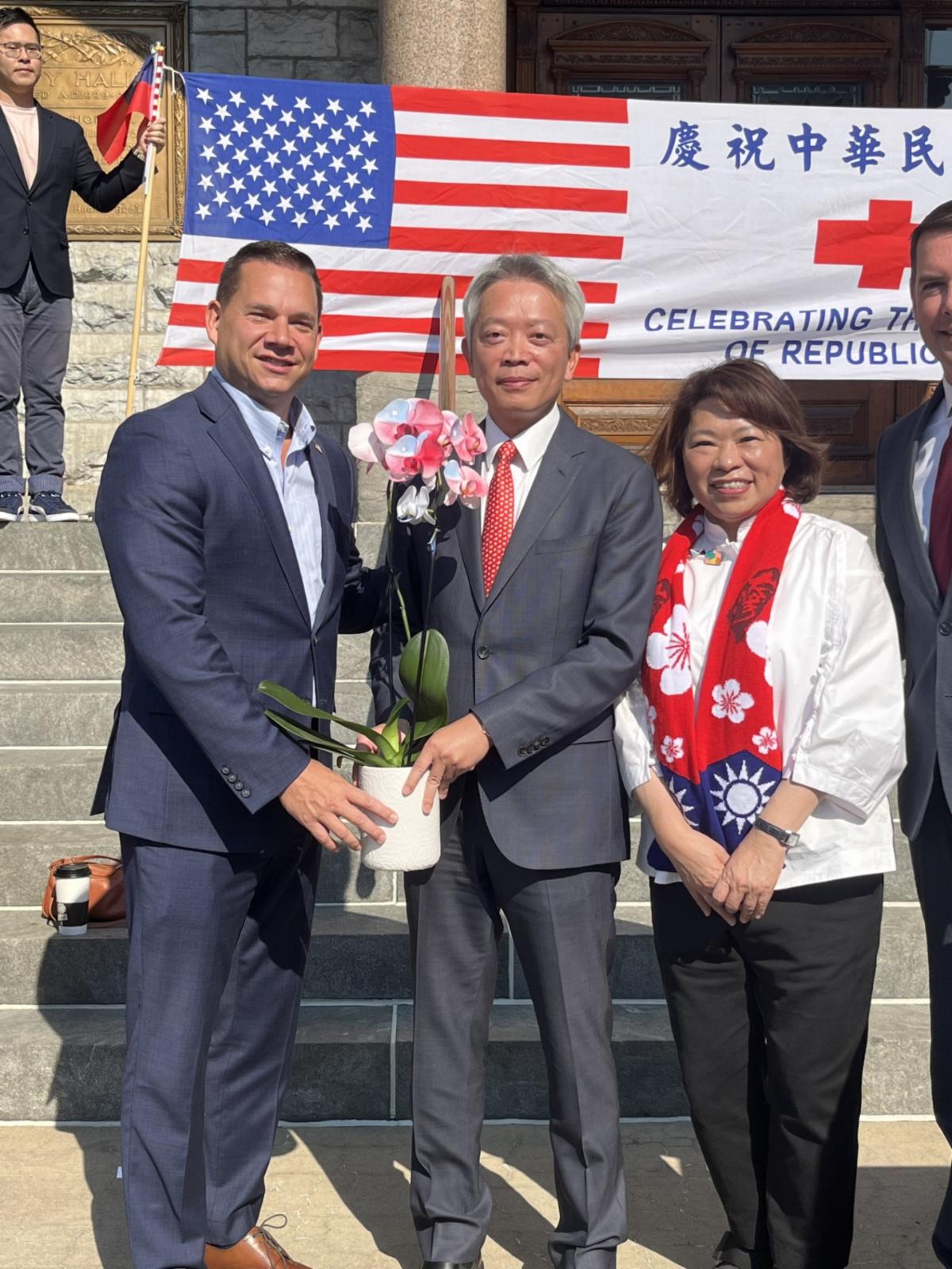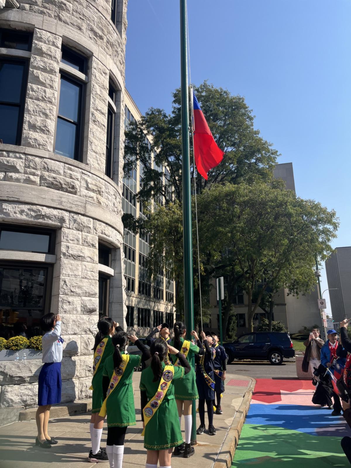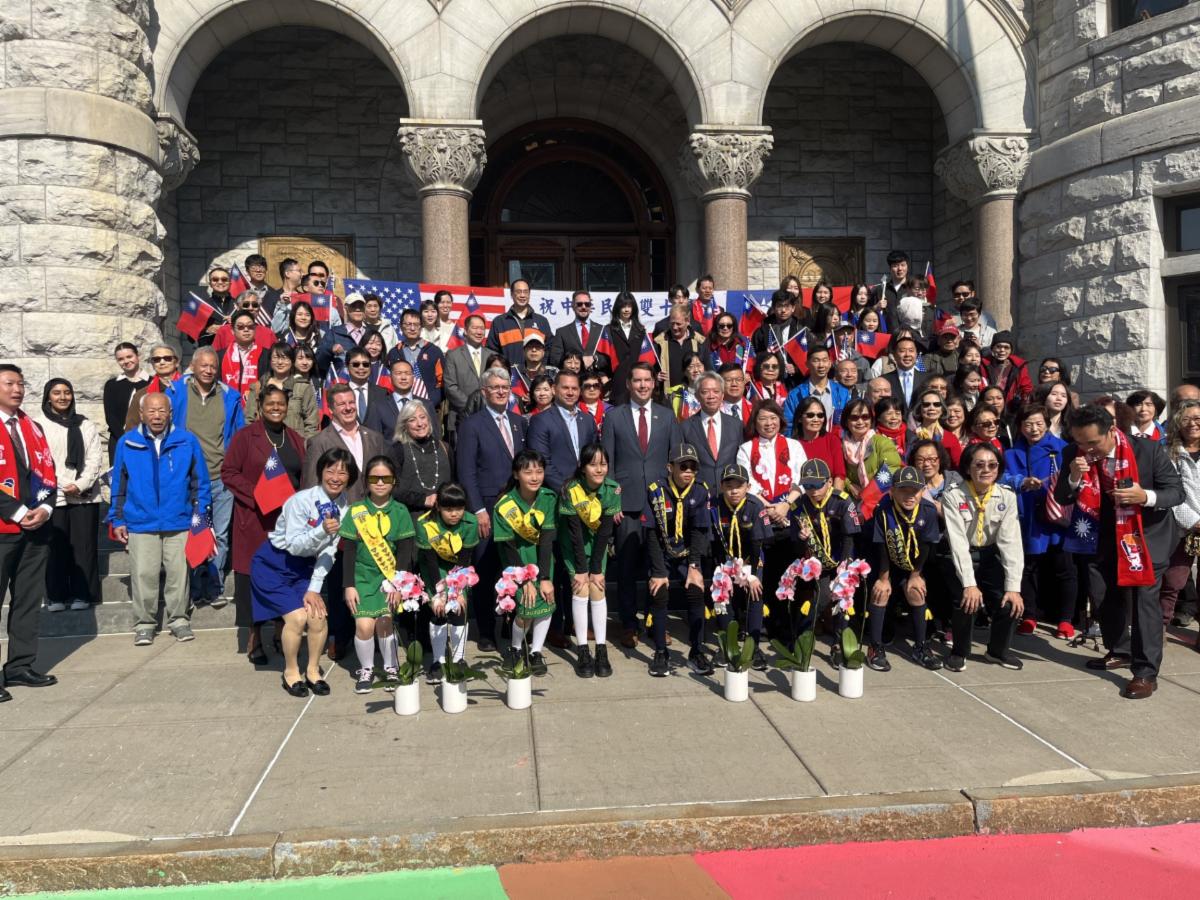 | In honor of National Day of the Republic of China, County Executive McMahon and City of Syracuse Mayor Ben Walsh presented a proclamation at the Taiwanese Flag Raising Ceremony to Taiwanese Ambassador Lee and local Taiwanese community members to proclaim October 11, 2024, as "Taiwanese American Friendship Day." This celebration marks the establishment of the Republic of China in 1911. | |