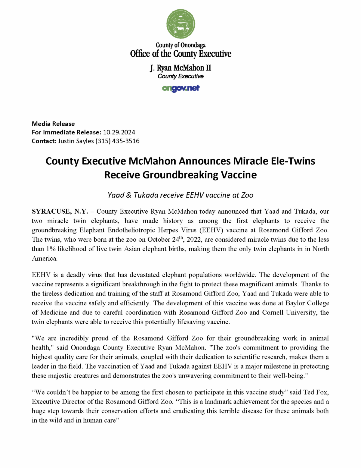 | For a list of all Child Care Enhancement Grant Recipients, click below: | County Executive McMahon Announces Miracle Ele-Twins Receive Groundbreaking Vaccine | County Executive McMahon Announces First Round of Awardees for Onondaga County Hotel Initiative | | |