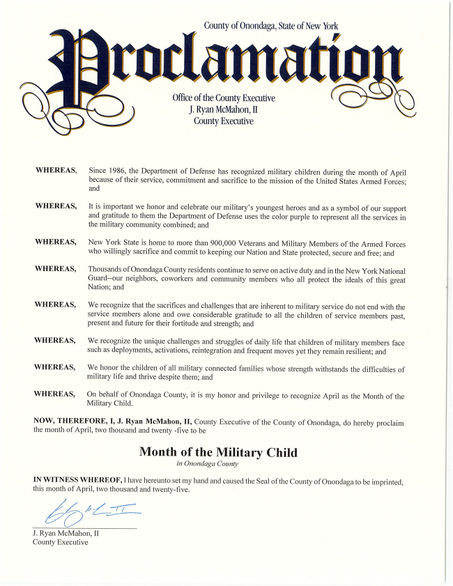County Executive McMahon presented a proclamation to honor the Month of the Military Child during an event at the Museum of Science and Technolgy (MOST).