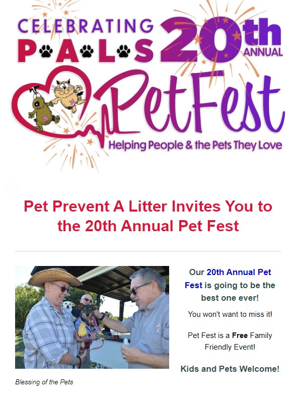 Pet Prevent A Litter (PALS) of Central Texas is hosting their 20th Annual Pet Fest on October 22, 2022 to promote responsible pet ownership, shelter pet adoptions, local rescue groups (like Paws in Prison!), and most importantly the continued efforts to have all pets spayed and neutered and zero pets in shelters. Pet Fest is a free, family-friendly festival that's designed to raise awareness as well as raise funds to help those in need to care for and fix their pets. PALS celebrates the 20th Anniversary of Pet Fest - saving lives through spay and neuter efforts.