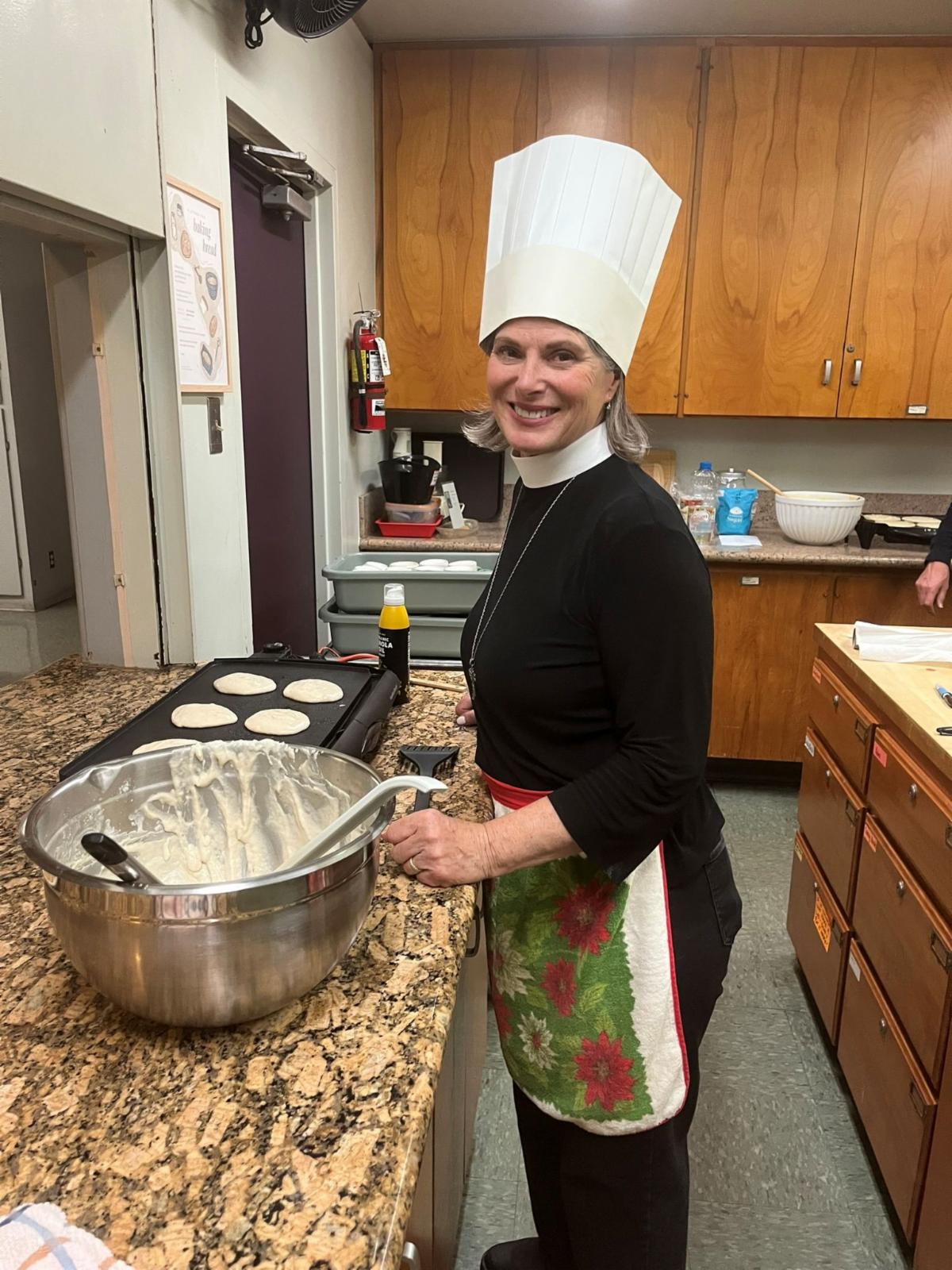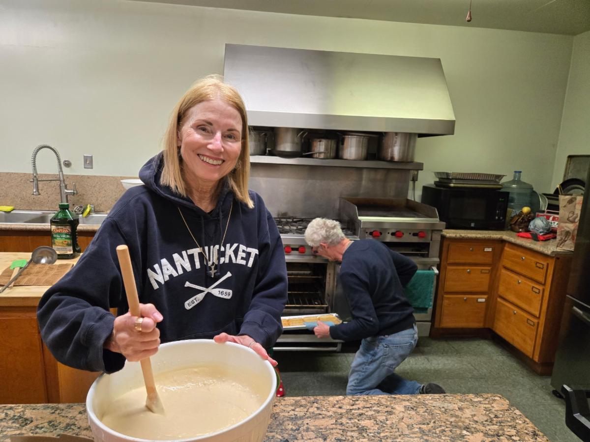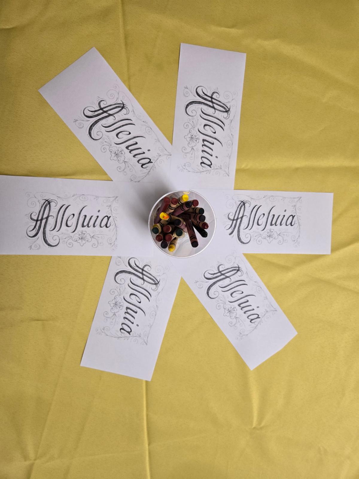 To celebrate Shrove Tuesday, St. Bede’s parishioners and guests gathered to enjoy a feast of pancakes (both vegan and traditional) prepared by chefs Jennifer and Jerry. The serving table was filled with butter, syrup, mixed berries, vegan and turkey sausages, and potato patties. Everyone indulged in the delicious meal, knowing Lent would start the following day. Dinner tables were decorated with crayons and papers containing the word "Alleluia" (the "A” word) which means Praise the Lord. Diners were encouraged to color the word and write something they wished to let go of by the end of Lent on the back of the paper. These papers were collected into a box, symbolically referred to as a "coffin."