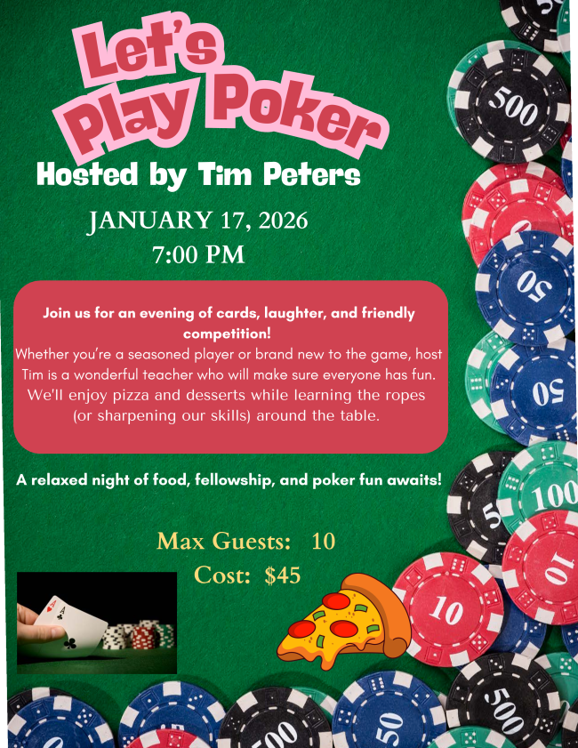 | | ONE SPOT LEFT for POKER NIGHT on 1/17 | | Space is still available! Come and have fun while you learn to play poker or sharpen your poker skills. | | |