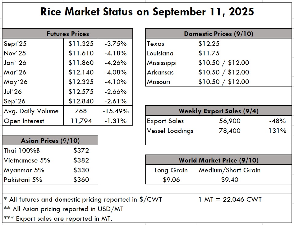 Bins across rice states are filling up with a crop that has yet to find a home. Paddy exports have dropped nearly 50% from this time last year, and milled exports seem to now be solely dependent on Iraq fulfilling its MOU. With each new announcement of an Iraqi tender, the industry breathes a collective sigh of relief. Finding a home for this crop will be a tall order with short prices, but it must be done. Louisiana and Texas are all but complete, while Mississippi and Arkansas are both about 50%. Missouri is now about a third of the way through. California got a spell of cooler weather this week, which means producers are still waiting for harvest to begin in earnest until next week. For U.S. long grain rice, the question is 2026. Comments are being offered about a 25% reduction in planting next spring.