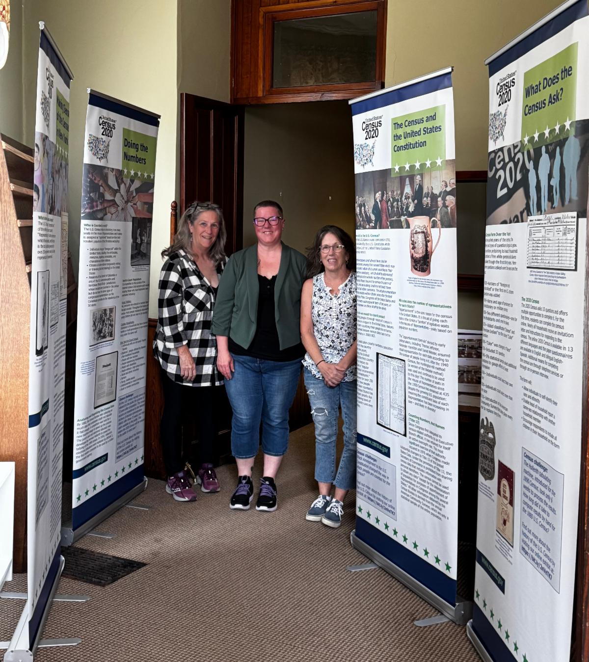 Pictured with the census exhibit are Sue Moyer (Assistant Director) , Erica Moses (Library Director), and Molly Pike (Board President).