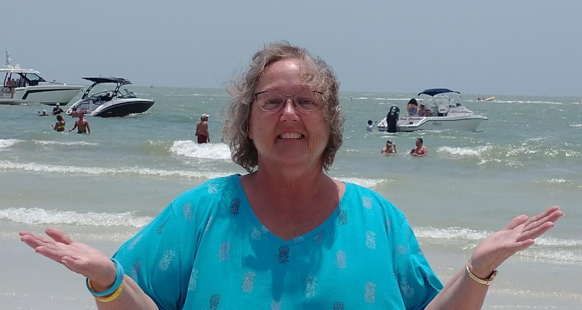 One amazing thing about our “senior” performers is that their ages cover at least two generations. This spring brought the birthdays of the oldest performer in our ranks, Jim Okey (or is Alice Thompson wrestling you for that honor?) and the very youngest, 60-year-old Geri Derner. (Well, we haven’t actually heard Geri perform yet, but just imagine a Manilow song emitting from this photo on a Key West beach!)
