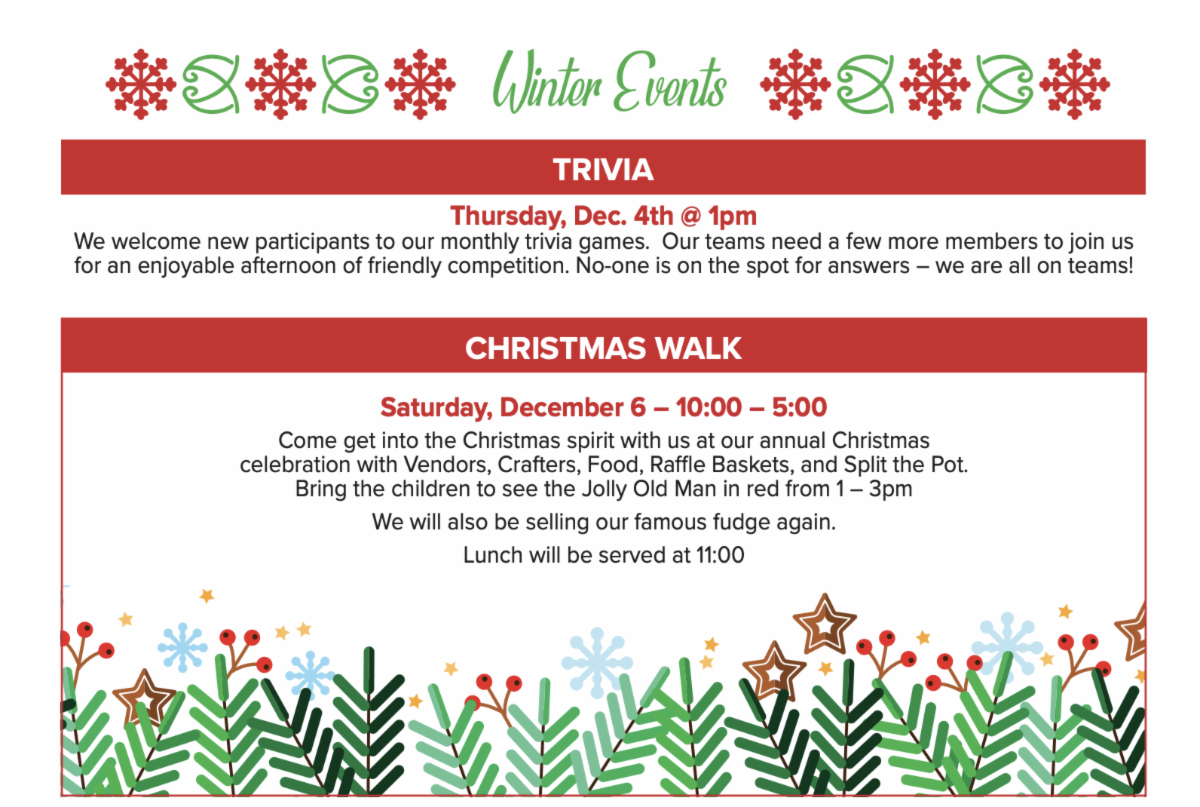 This is always a busy time of year, and this week will be no different as the Christmas Walk Committee meets for the final time before next Saturday’s event. While there are a few last-minute details to refine, please know our traditional celebration will take place next Saturday, beginning at 11:00 a.m.