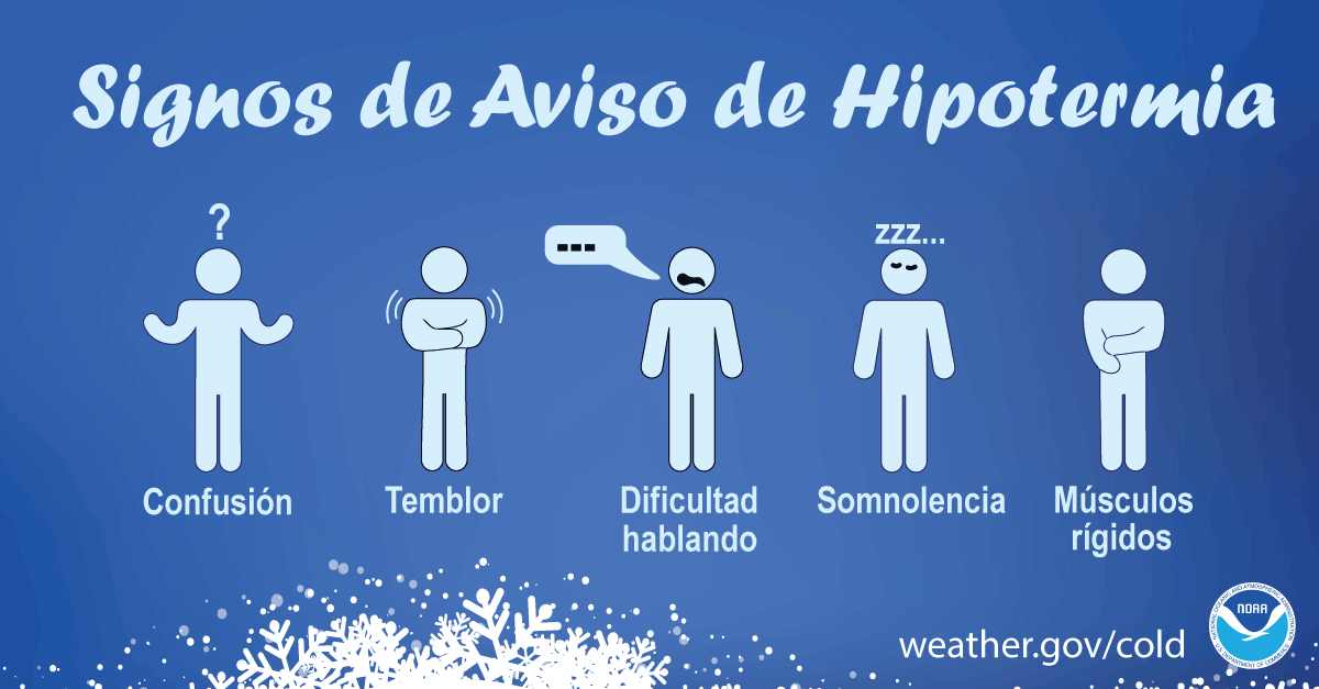 Conozca los signos de la hipotermia y verifique a otros(as): La hipotermia puede manifestarse con escalofríos, confusión, habla arrastrada o sensación de cansancio. Si nota