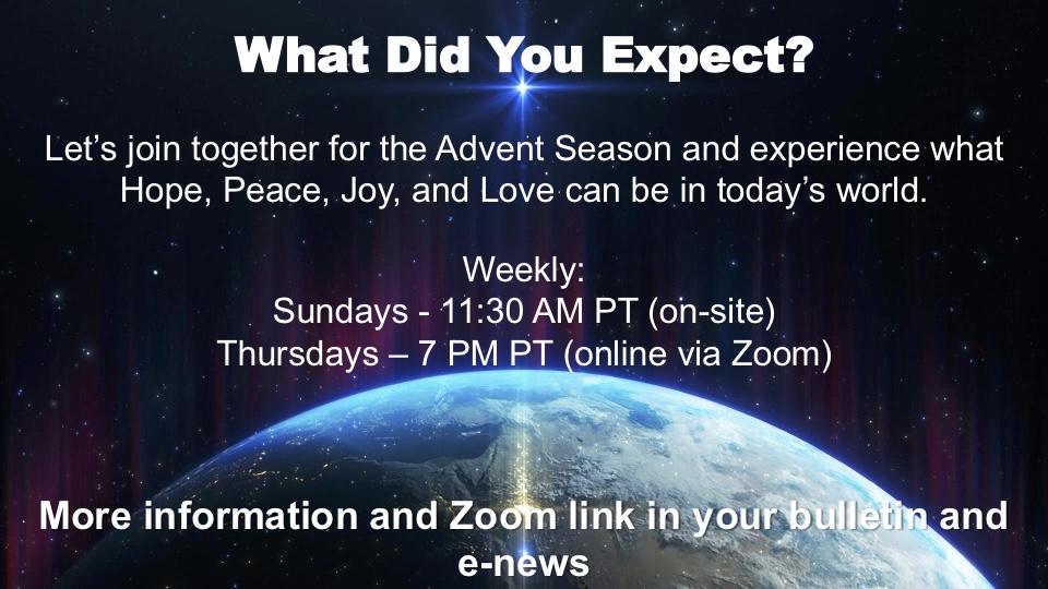 Este domingo es el primer domingo de Adviento, y también es un quinto domingo. Tendremos toda la música durante el tiempo de adoración, y comenzaremos la temporada de Adviento con una concentración en la Esperanza. Quiero darle las GRACIAS a todos los que han ayudado a decorar la iglesia. Ha sido un trabajo de amor y sacrificio, y no puedo agradecerles lo suficiente a todos por su dedicación a FMCC/ICMF.