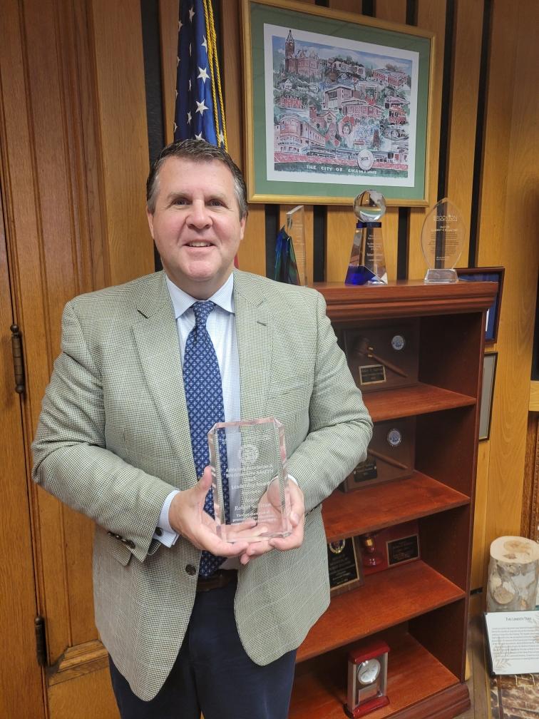 Mayor Robert F. Sullivan in receipt of award with inscription, AdMeTech Foundation & Brockton Area NAACP's 2025 Leadership Award presented to Mayor Robert Sullivan, Tireless champion of prostate cancer education, research and health care equity.