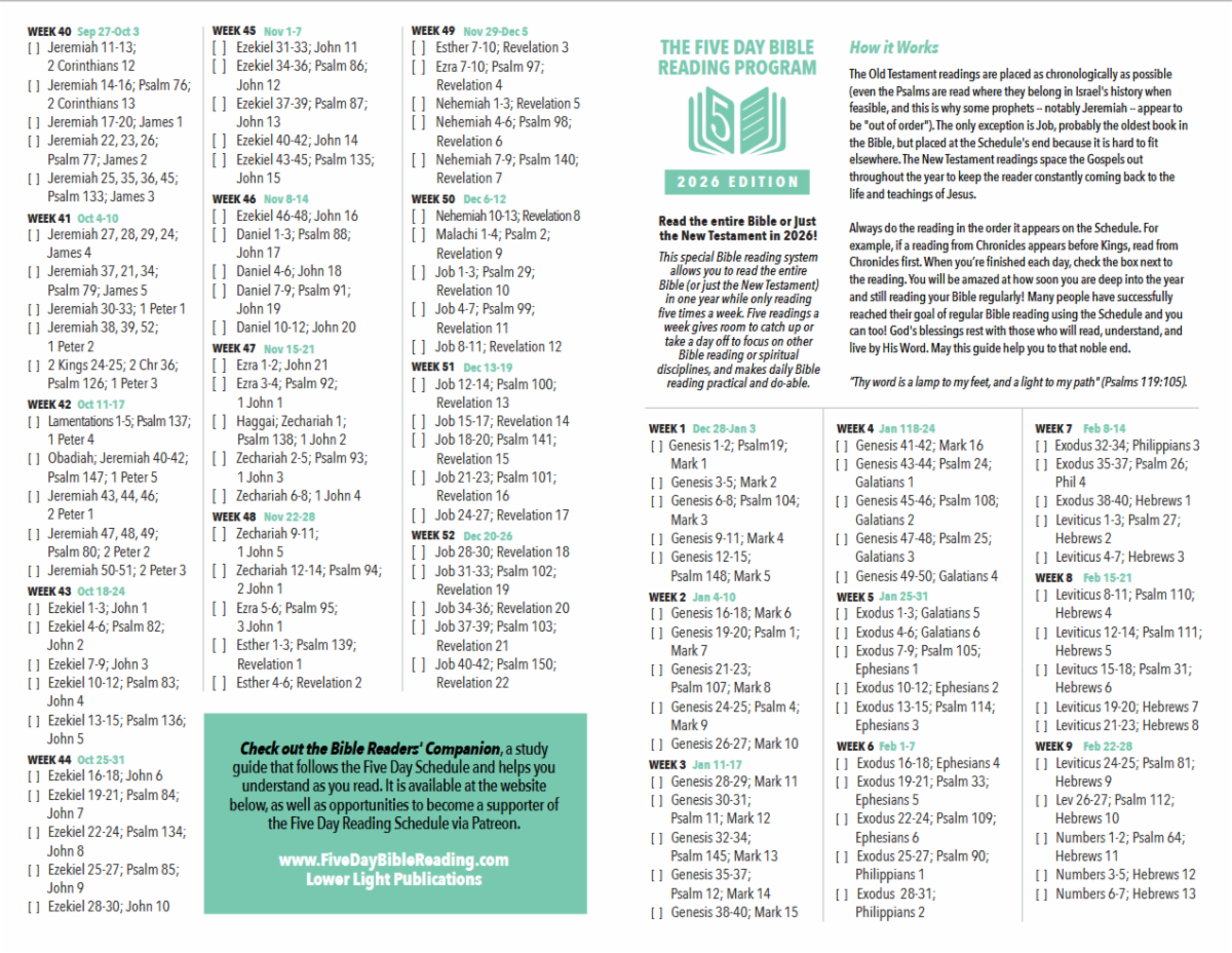 This special Bible reading system allows you to read the entire Bible (or just the New Testament) in one year while only reading five times a week. Five readings a week gives room to catch up or take a day off to focus on other Bible reading or spiritual disciplines, and makes daily Bible reading practical and do-able.