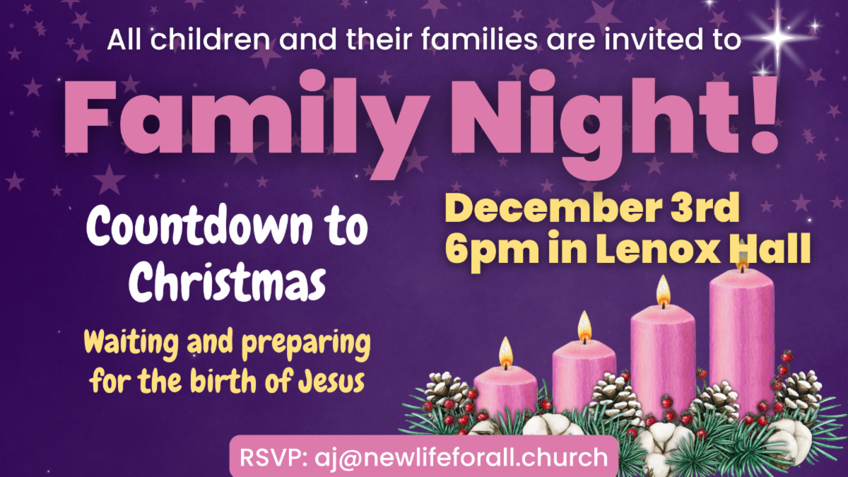 All children and their families are invited for dinner, fellowship and fun the first Wednesday of the month in Lenox Hall. Please RSVP to AJ Rilat, aj@newlifeforall.church.