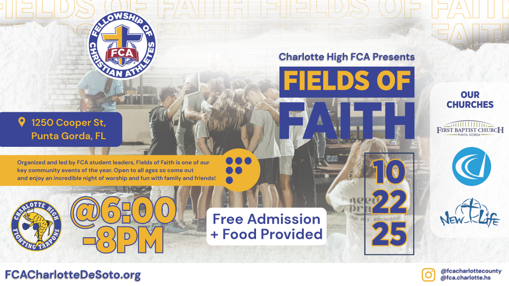 All are welcome to join us next Thursday Oct. 22nd as we partner with Fellowship Christian Athletes for “Fields of Faith." This special event is totally free and will take place at Charlotte High School football stadium. It all starts at 6pm with food, then 6:30-8pm will include singing, prayer, testimonies from students, professional athletes, and more.