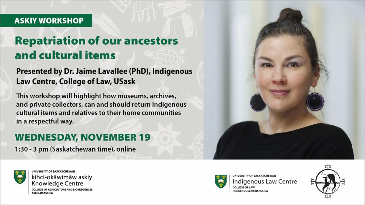 This workshop will highlight how museums, archives, and private collectors, can and should return Indigenous cultural items and relatives to their home communities in a respectful way. Join Dr. Jaime Lavallee, from USask’s College of Law and the Indigenous Law Centre, as she discusses her experiences with this important work from a legal and nēhiyawēwin perspective.