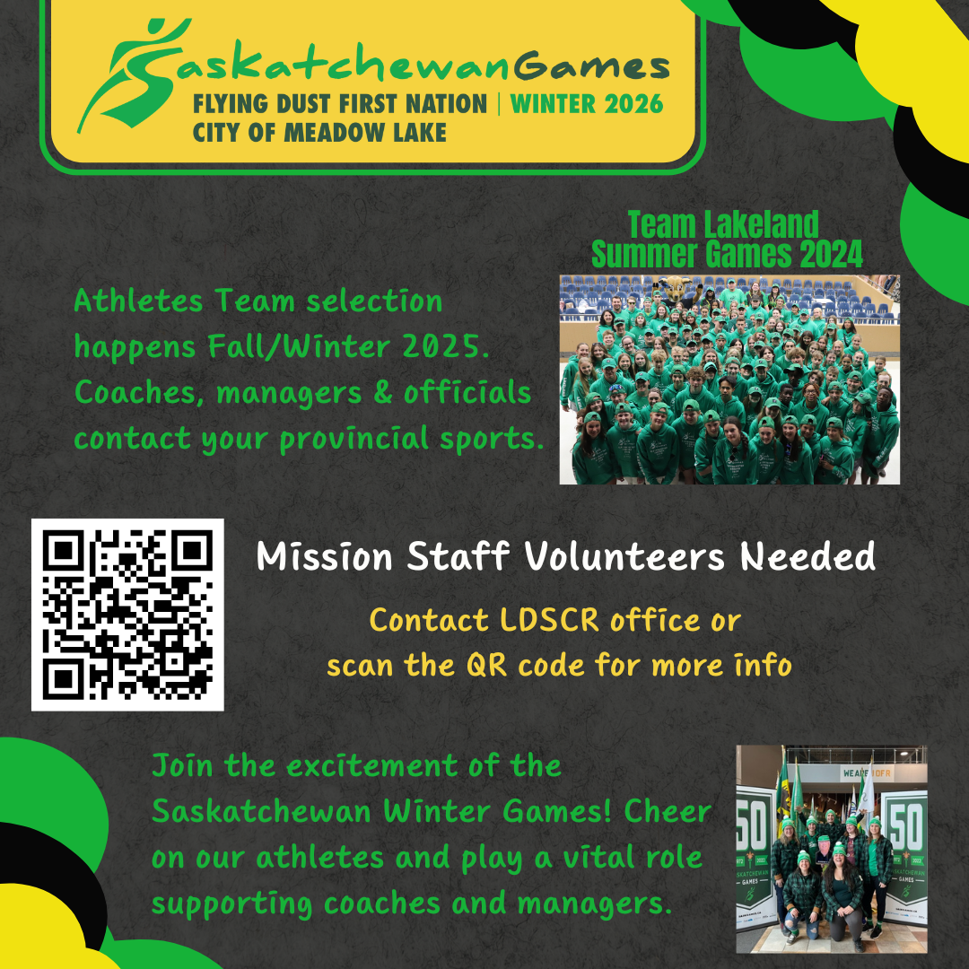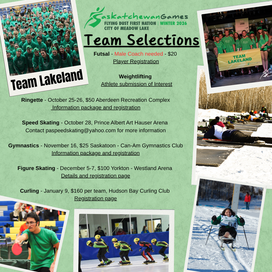 Visit the Saskatchewan Games Council webpage for information on Getting Involved with Team Lakeland at the 2026 Saskatchewan Winter Games hosted by Flying Dust First Nation and the City of Meadow Lake.