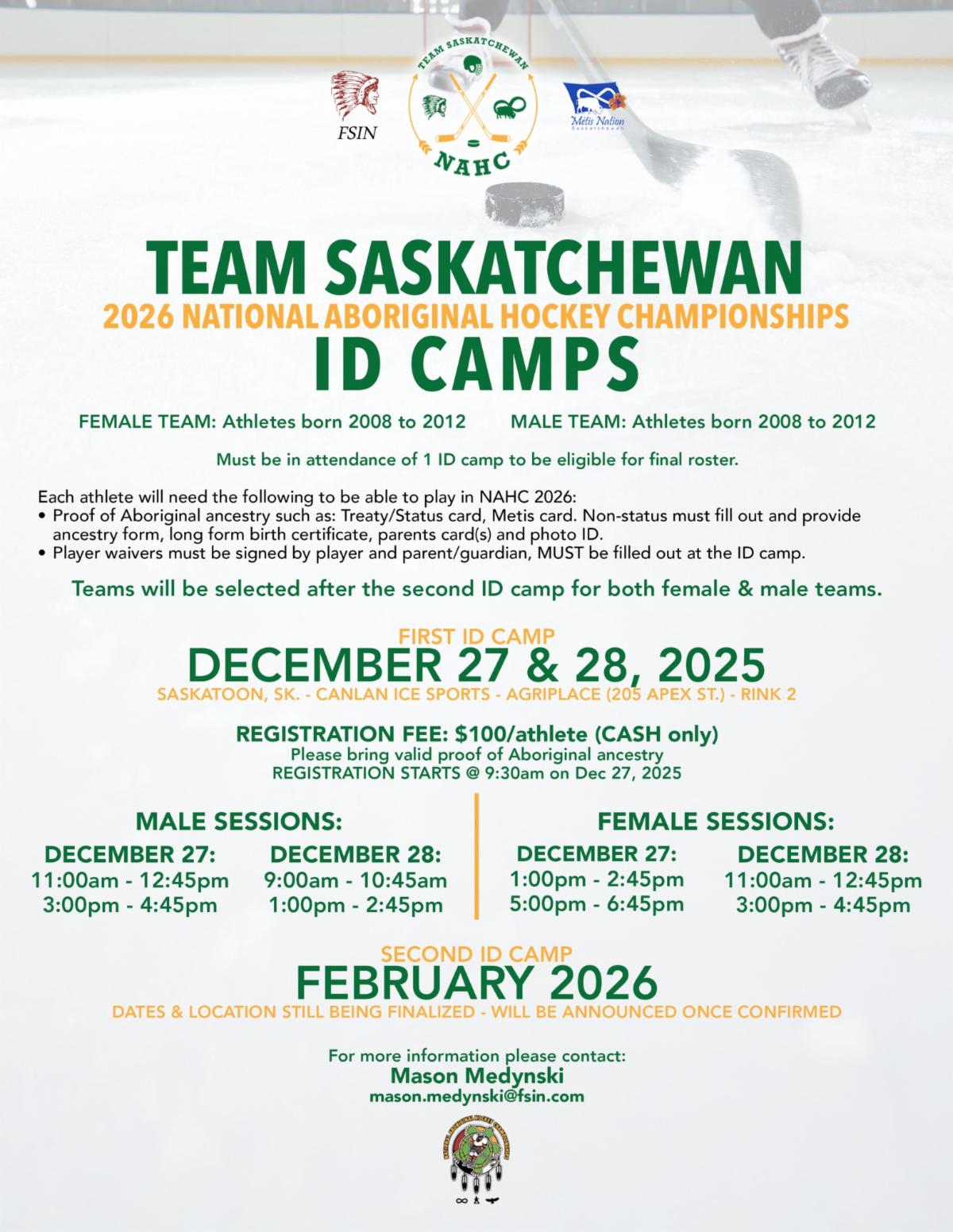 Team Saskatchewan is gearing up for the 2026 National Aboriginal Hockey Championships (NAHC) in Regina, SK - and we’re hosting ID Camps to identify athletes for our male and female teams!