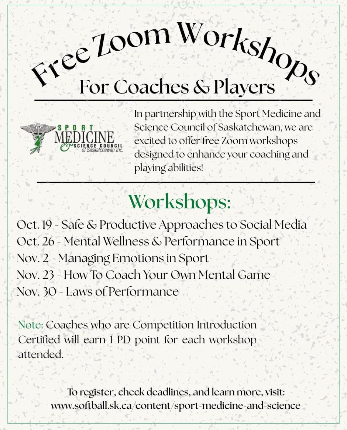 Softball Saskatchewan partnered with The Sport Medicine & Science Council of Saskatchewan to bring you FREE virtual workshops to elevate your coaching and playing game!