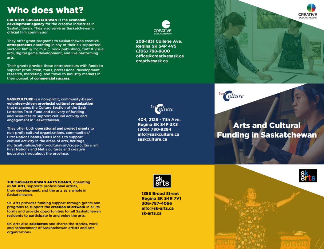 SaskCulture, SK Arts and Creative Saskatchewan provide funding to Saskatchewan's arts and cultural sector. Each funder has a different focuss on what can be supported. To gain a better understanding of what each funder does take a look at the the Arts and Cultural Funding in Saskatchewan pamphlet.
