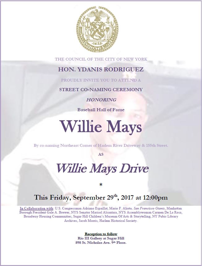 NEW YORK REMEMBERS LEGENDARY BASEBALL PLAYER AND HALL OF FAME BY UNVEILING "WILLIE MAYS DRIVE" TO HONOR & CELEBRATE HIS LIFE & CONTRIBUTION TO OUR STATE