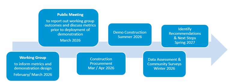 Prior to construction, DOTI will reengage with the broader community to discuss more details of the demonstration as well as report out any efforts made by the working group. In addition to the metrics mentioned above, the working group will help craft a community survey to provide feedback on the demonstration. This will be deployed about 6 months after the project is implemented.