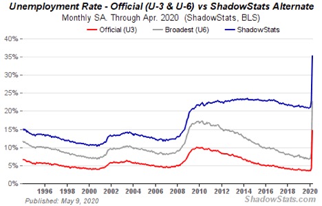 ShadowStats Alternate Unemployment for April 2020 is 35.4%, 39.6% net of BLS errors (see Flash No. 1435).
