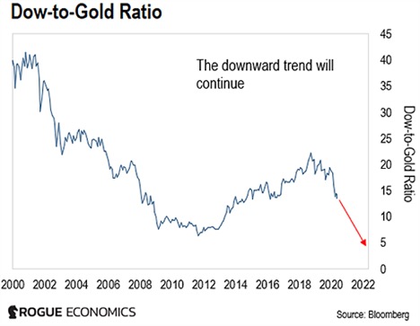 This chart shows what I’m talking about. It shows stocks (specifically the Dow) priced in gold.