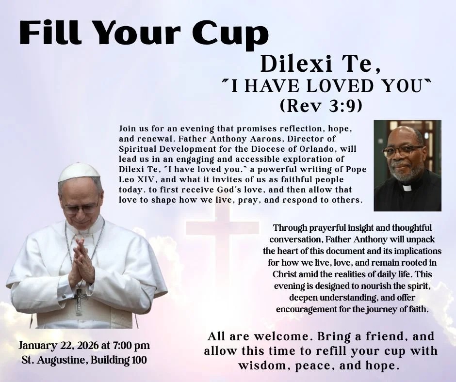 Our Diocesan Eucharistic Encounter event will be held March 6 and 7, 2026 in two locations. On Friday night, we will be at Queen of Peace in Gainesville. On Saturday, we will be at St. Joseph Parish in Jacksonville. This Eucharistic Encounter will have at its heart an evangelization focus, particularly in how it the Eucharist draws us closer to Christ.
