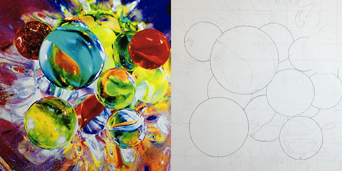 1. Here is my photo reference and drawing of the marbles. I did the basic drawing on separate paper and transferred to my watercolor paper using a light table. That way, if I need to start again because disaster happens, or want to try the subject with a different color palette, I don't have to go back to square one and do the drawing again. This would be especially useful for a more complicated subject but I have adopted this way of working.