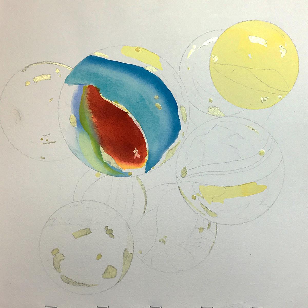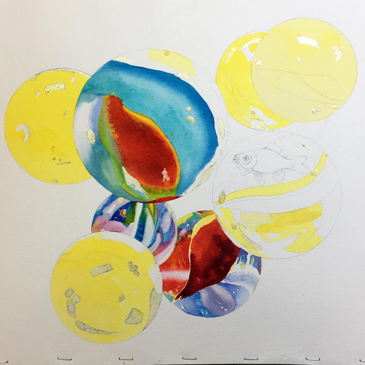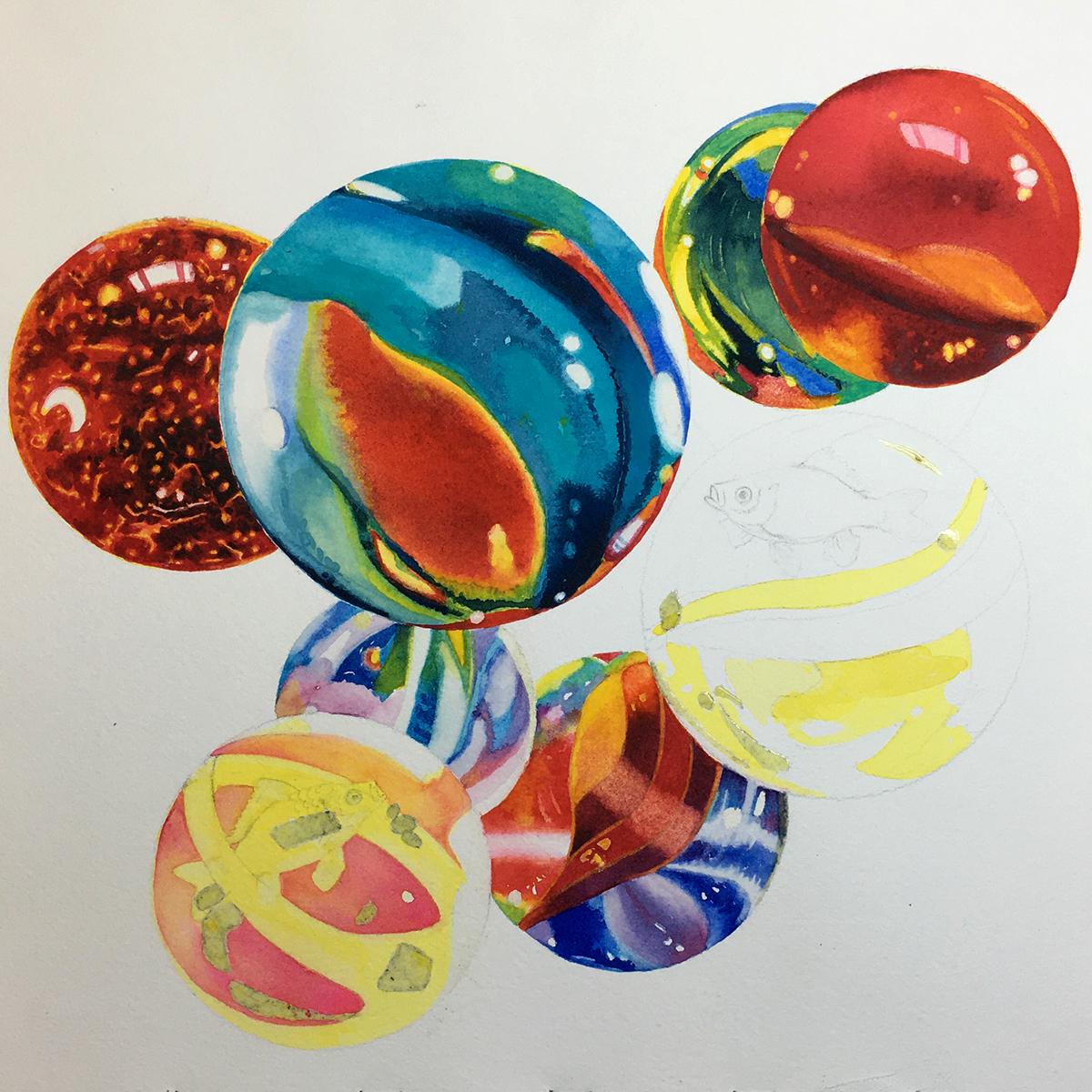 3. I continue to detail the marbles, putting a yellow wash anywhere that I know my final color (red, green) will benefit from it. I draw a fish where I know I want it.
