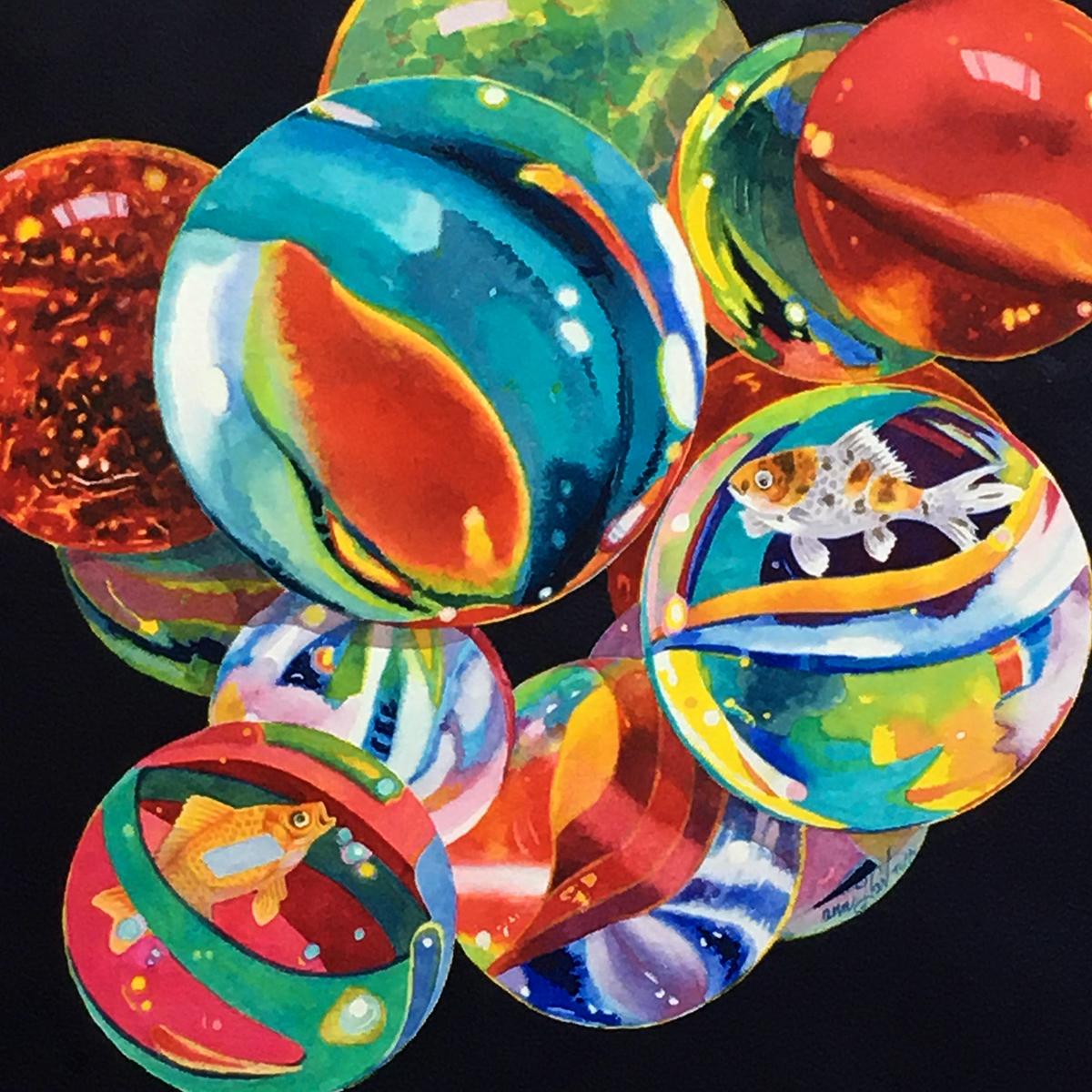 5. I add a few set back marbles that I feel are needed and decide on a solid dark background (a mix of pthalo blue and orange). I add more darks to the marbles, tweak edges and highlights, detail the fish. That's it, "Worlds Apart" is finished. Watercolor on 140# Arches coldpress paper, 10" x 10".