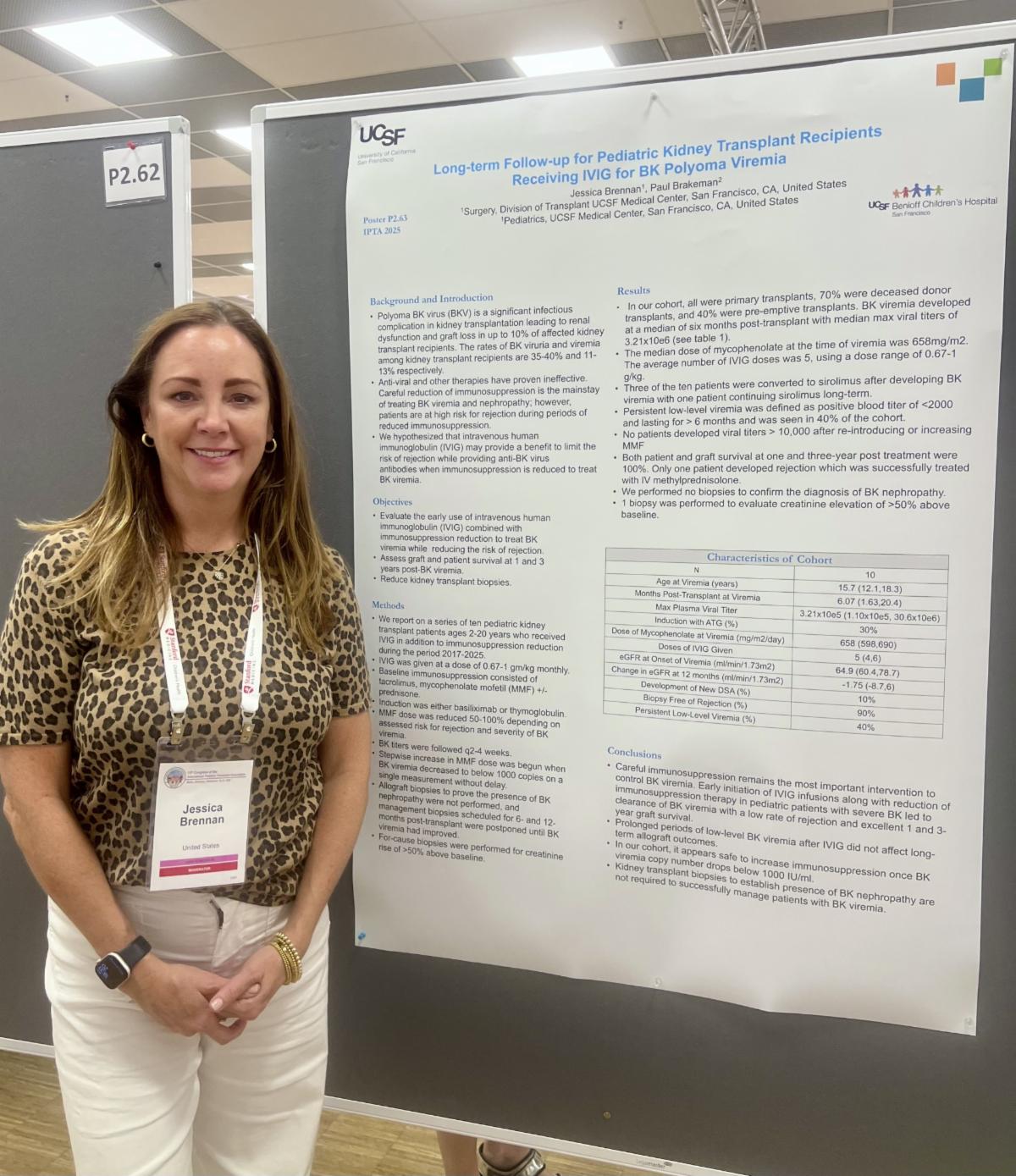 Jessica Brennan, NPIII in the Pediatric Transplant Surgery Depattment traveled to Berlin, Germany for the International Pediatric Transplant Association (IPTA) conference. At the conference not only did she moderate a session on ethics and organ allocation, but she presented data on kidney transplant patients receiving IVIG while being treated for severe polyoma BK viremia. She is also an active member of the infectious disease committee for IPTA.