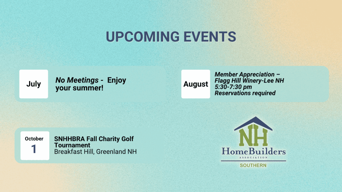 The Government Affairs Committee has the ‘finish line’ in sight on many different pieces of legislation that they have been working through the process. Governor Ayotte is onboard and is totally Pro Builder, so keep an eye out for emails for bill signings and great news that is soon to come. Building next year in New Hampshire will be a lot easier than it is today. Thank you to the Committee and State Staff for the dedication to keep an eye on more than 150 pieces of legislation.