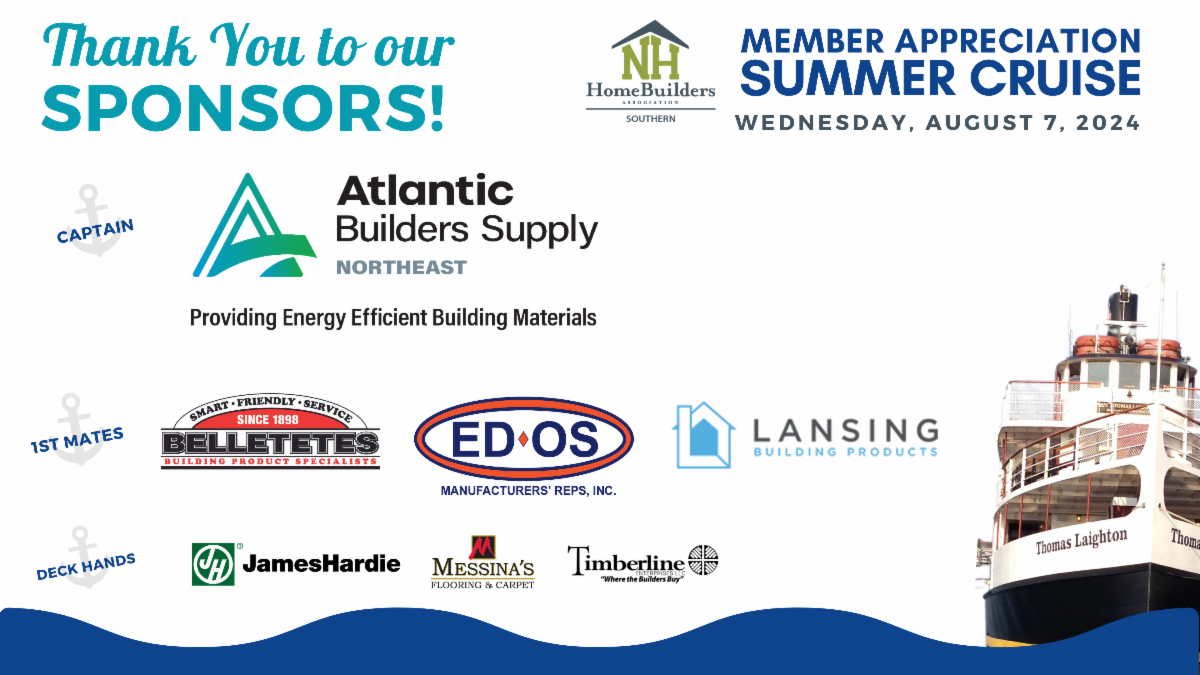 We are in the throws of the time that we call the “Dog Days of Summer:” long, hot days with lots of humidity. Great for growing crops and building new homes! I know our Builder Members are in full swing taking advantage of the heat and the mostly good weather to get a lot of houses well underway. One hundred twenty of us did take an evening off on the 7th for a Portsmouth Harbor Cruise for our Member Appreciation Event. The food was terrific and the weather was absolutely stunning. A huge THANK YOU to Lynette Rogers and Alison Milioto, two of our awesome Board Members, who were the Committee for this fun-filled event. The caterers and the crew were top notch. And thanks to our many sponsors Atlantic Builders Supply, Belletete’s, Ed O’s, Lansing Building Products, James Hardie, Messina’s Flooring and Timberline Enterprises, LLC whose generosity kept tickets prices very low. A great time was had by all. I can’t wait to see what we have planned for next year!