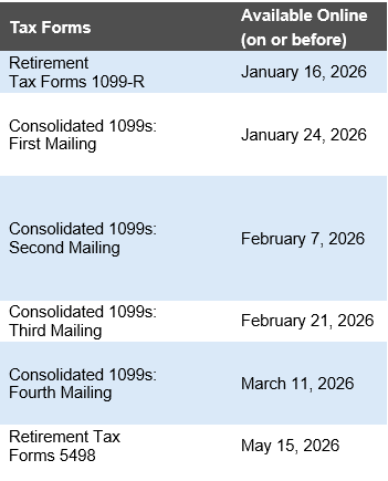 Our partner, National Financial Services (NFS), will post and mail consolidated 1099 tax forms in four waves. The dates are when your tax form will be available in Investor360°. They will be mailed five to seven days after they are posted online.