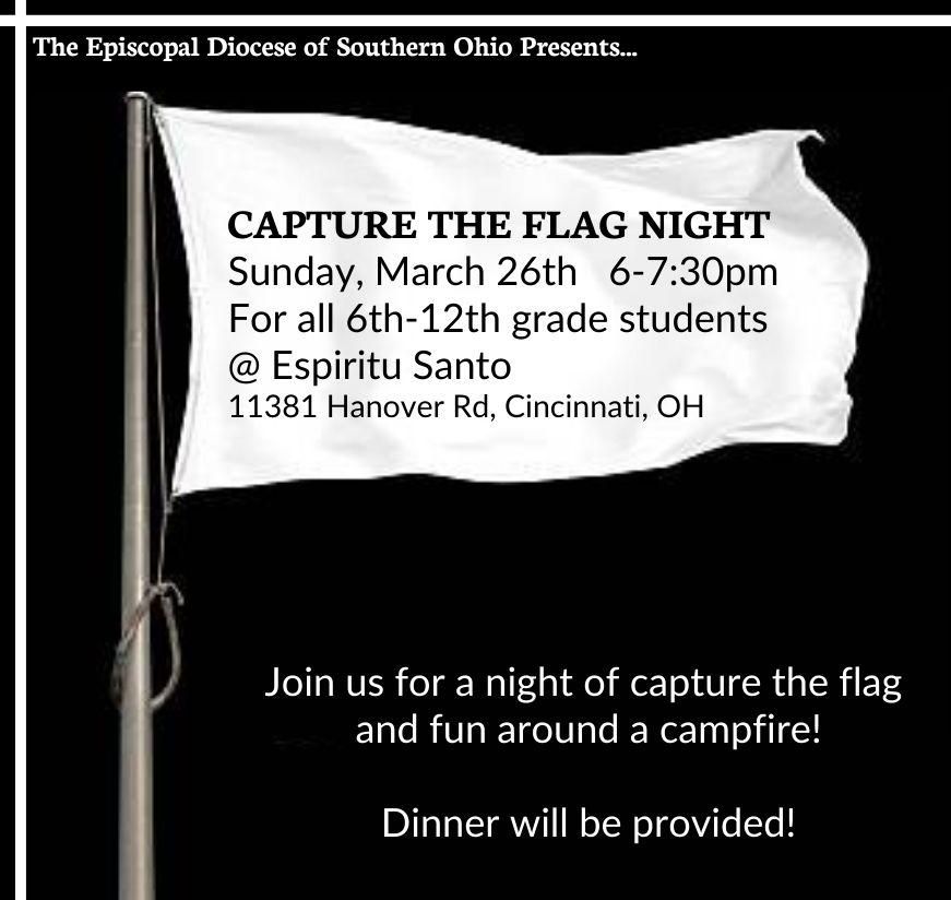 All 6th-12th grade students are invited to play Capture the Flag and have fun around the campfire at Espíritu Santo in Forest Park on Sunday, March 26 from 6 to 7:30 p.m. For details and to sign up vist bit.ly/belovedyouth Contact Adam Hayden with any questions 812-430-4464 / ahayden@diosohio.org.