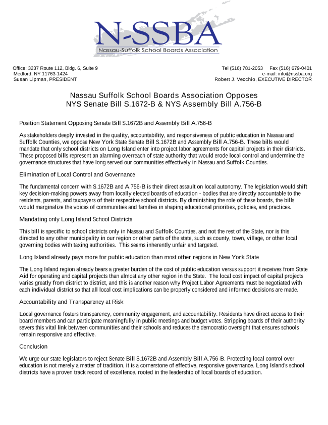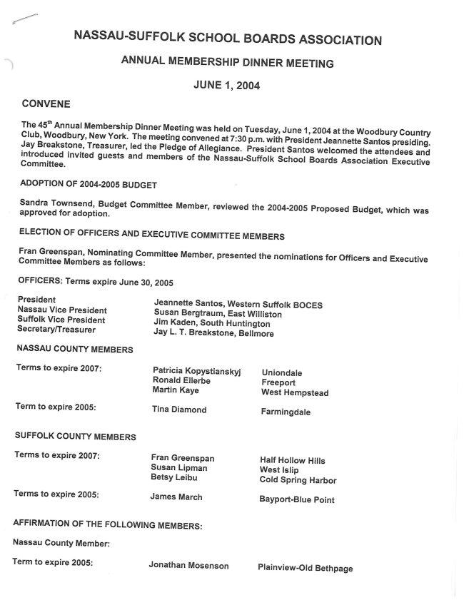 On a very personal note, I want to extend heartfelt thanks to the many members of the N-SSBA Executive Committee and staff, as well as those at Eastern Suffolk BOCES and my home district of West Islip, who have given me their support over the years. I will especially miss working as closely with Bob and Lorraine. However, you and they can continue to count on my support and involvement.