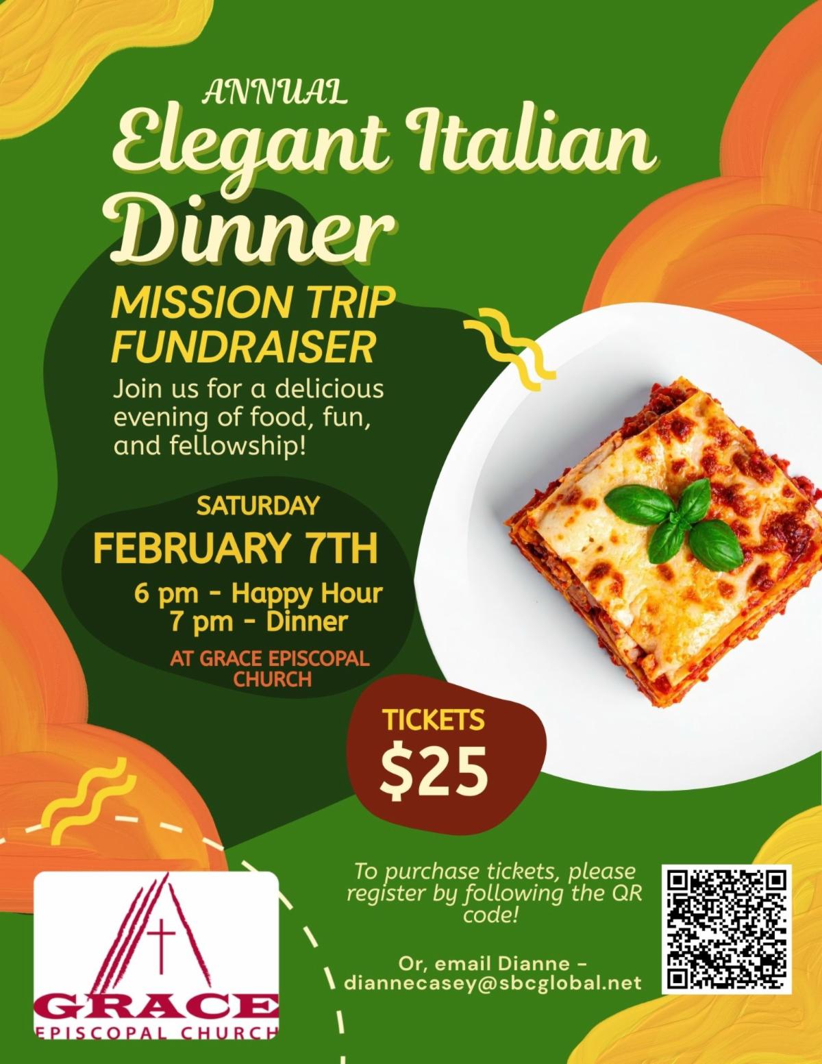 Sat, Feb 7 - Elegant Italian Dinner, Mission Trip Fundraiser. Please email Dianne (diannecasey@sbcglobal.net) to sign your young person up for a volunteering spot (Cooking and Prep - 2/5, Serving - 2/7)