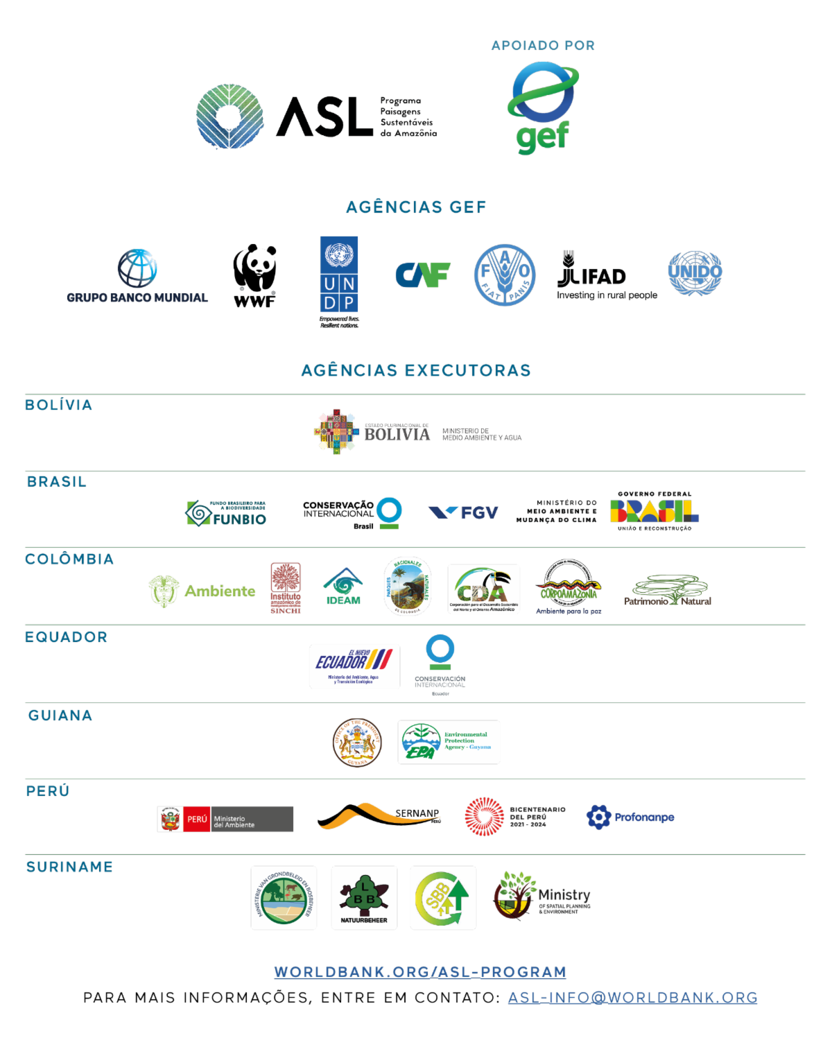 | | O Programa Paisagens Sustentáveis da Amazônia (ASL), financiado pelo Fundo Global para o Meio Ambiente (GEF, por suas siglas em inglês) e liderado pelo Banco Mundial, adota uma abordagem regional integrada na Bolívia, Brasil, Colômbia, Equador, Guiana, Peru Suriname, e Venezuela. Seu principal objetivo é aprimorar o gerenciamento integrado da paisagem e a conservação do ecossistema em áreas prioritárias da Amazônia. | | | | | |
