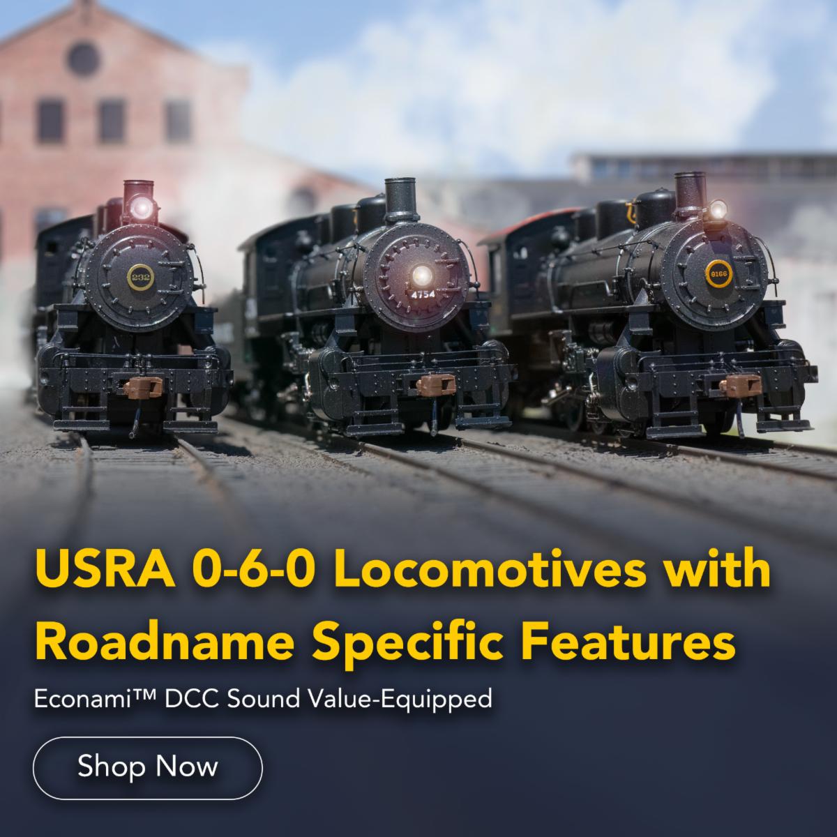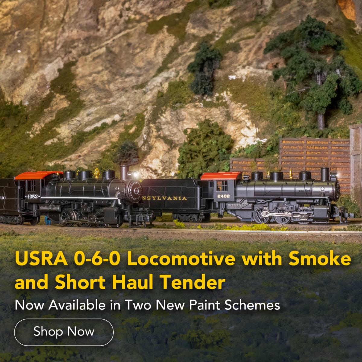 With production beginning in 1918, the USRA 0-6-0 was one of a selection of locomotives designed by the United States Railroad Administration during the brief period in World War I when the US rail network was placed under government ownership. Classified as a light switcher, the type saw widespread success in both light freight and yard duties, and many railroads went on to run these plucky workhorses for several decades once the rails were turned back to their original operators. Bachmann's USRA 0-6-0 features realistic detail, a working headlight, and an operating smoke unit. Performs best on 18" radius curves or greater. |