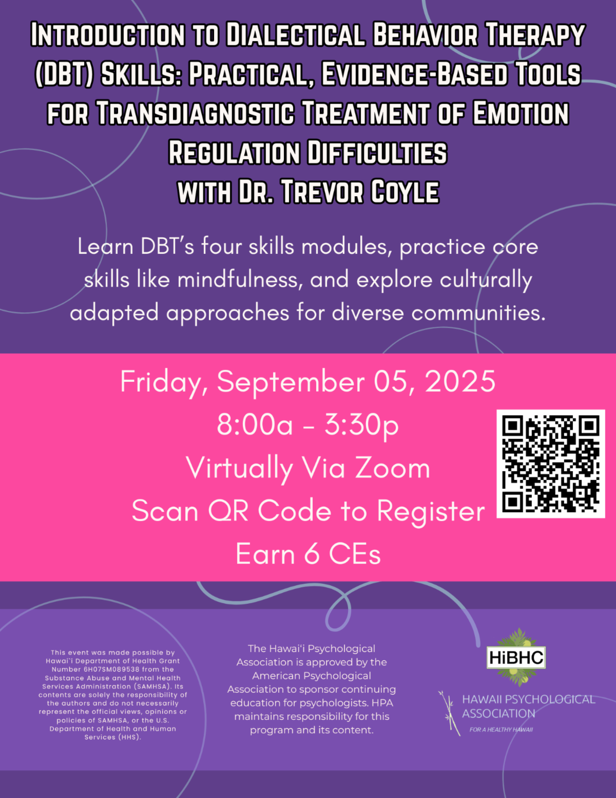 The Hawaiʻi Psychological Association and Hawaiʻi Behavioral Health Connection (HiBHC) have partnered to present a 6 APA CE Training Presented by Dr. Trevor Coyle on Dialectical Behavior Therapy Training on Friday, September 05, 2025 from 8:00am - 3:30p, virtually via Zoom!