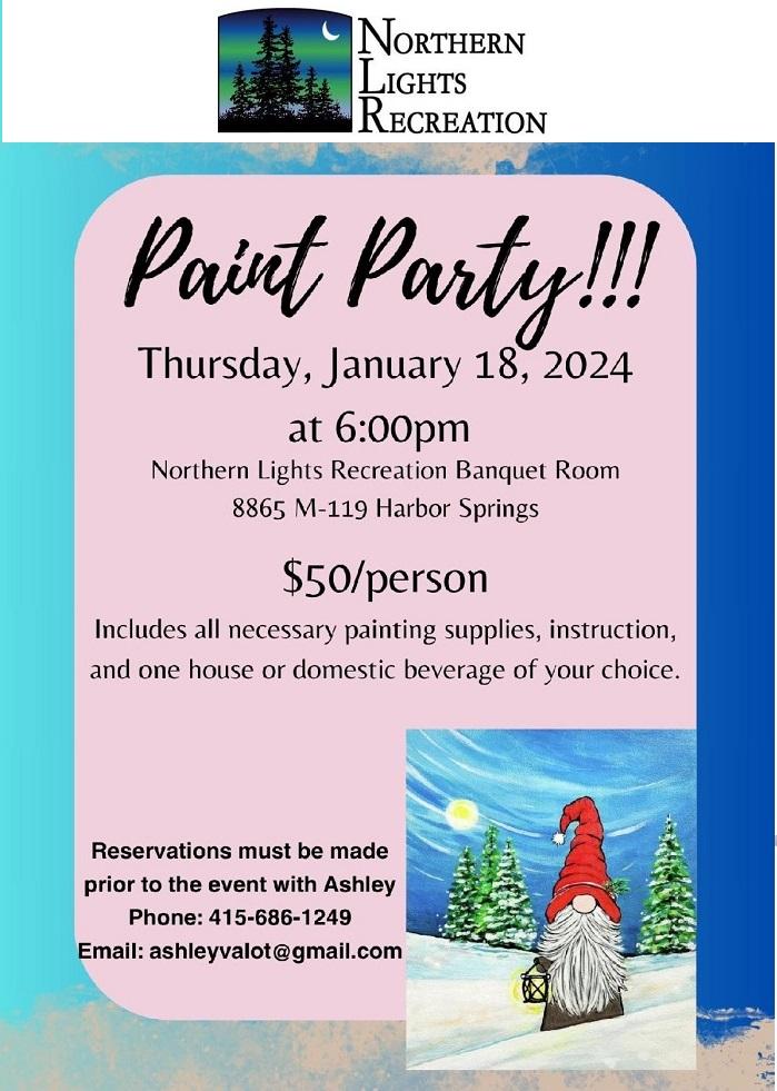 PAINT PARTY - Northern Lights Recreation is hosting a Paint Party at 6 p.m. Thursday, January 18, at 8865 M-119 Harbor Springs. $50/person Includes all necessary painting supplies, instruction, and one house or domestic beverage of your choice. Reservations must be made prior to the event with Ashley, phone 415-686-1249 or email ashleyvalot@gmail.com.
